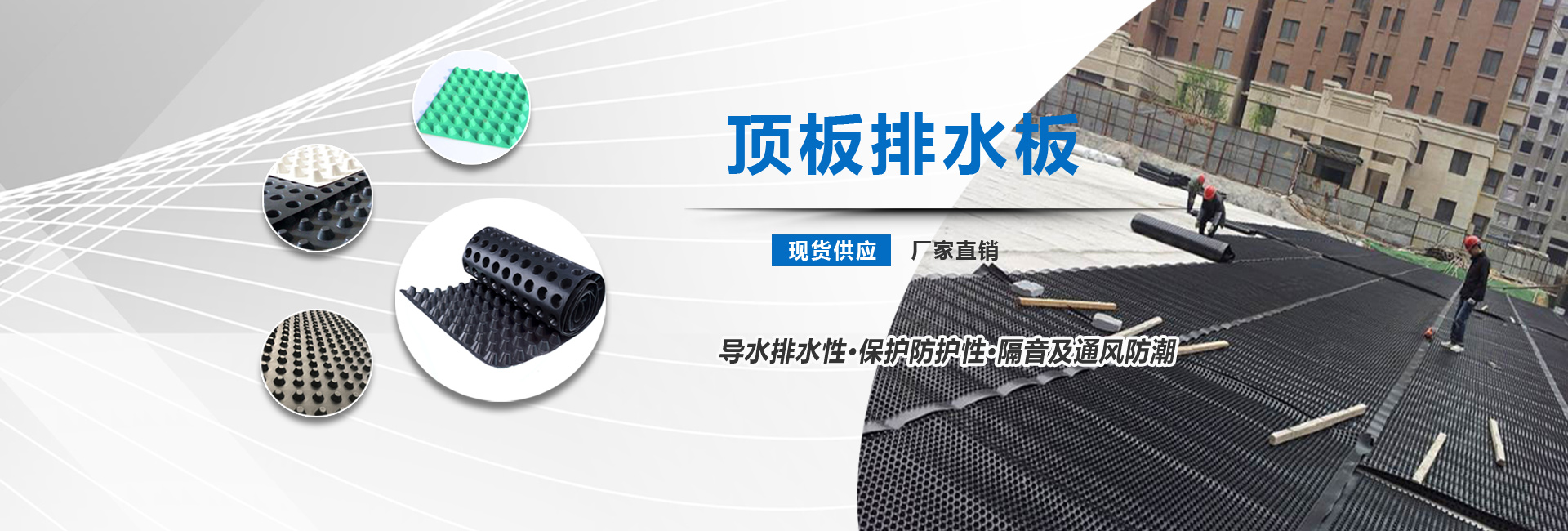 排水板是由聚苯乙烯(HIPS)或者是聚乙烯(HDPE)塑膠底板經過沖壓制成圓錐突臺或者加勁肋的凸點(或中空圓柱形多孔)而成,幅寬有3米,長度有10米或者是15米。 施工中常用的排水